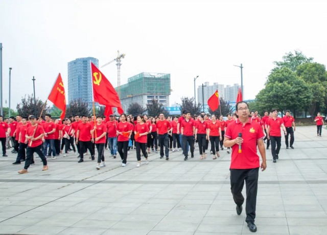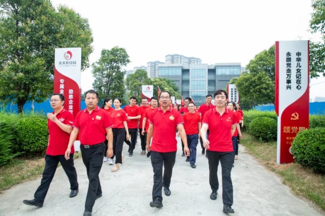 蔚藍(lán)的天空下,闊大的中心湖平臺上,一面鮮艷的黨旗高高聳立。兩名旗手高舉黨旗和國旗,沿著炎黃科技園黨建長廊向平臺飛奔而來。